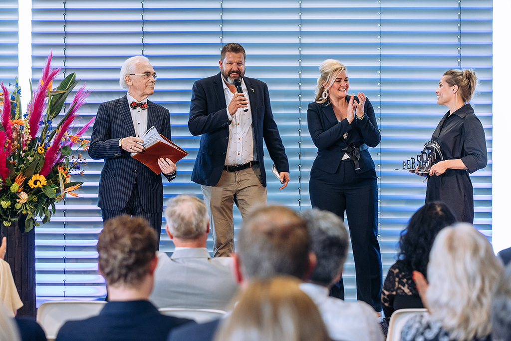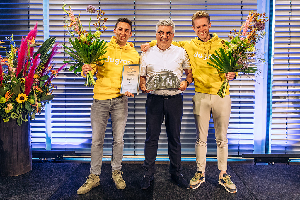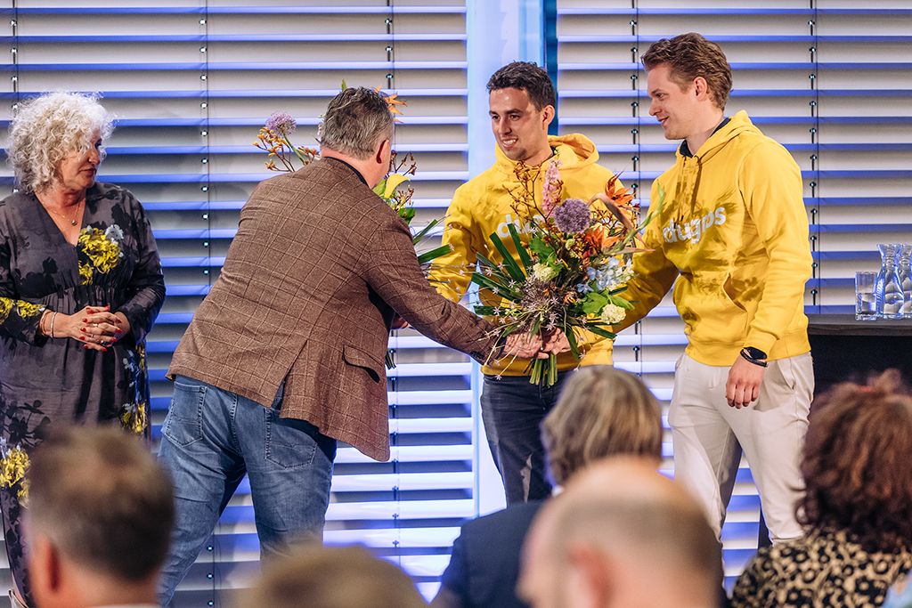 Pieter Duifhuizen van Dugros vertelt vol trots op het podium: ‘Ons familiebedrijf is in 1953 opgericht. We zijn trots op ons schitterende bedrijf en onze medewerkers. We ontwikkelen en produceren onze eigen lijnen van tassen, die we inmiddels ook ver buiten Nederland verkopen.’ De award werd uitgereikt door juryvoorzitter Steven Corijn en Stefanie Verrijp, directeur van Kivodo en winnaar van de prijs in 2019. ‘Een prachtige opvolger en tijdens het jurybezoek voelde ik me in een vrouwenparadijs’ aldus Verrijp, die hiermee de lachers op haar hand krijgt.